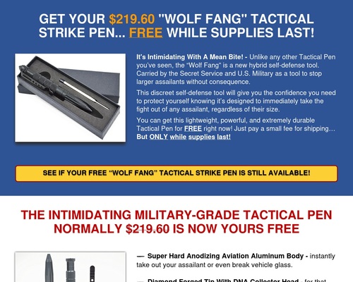 P.S. – Missing out on this deal is not worth the risk! The “Wolf Fang” Tactical Pen is the most reliable, powerful, and concealable self-defense weapon you can depend on at a moment’s notice…always there when you need it to defend yourself or your family! And it seriously doesn’t get any cheaper than FREE. Grab yours before you head out by covering the small shipping cost and it’s all yours absolutely free – but hurry before supplies run out!